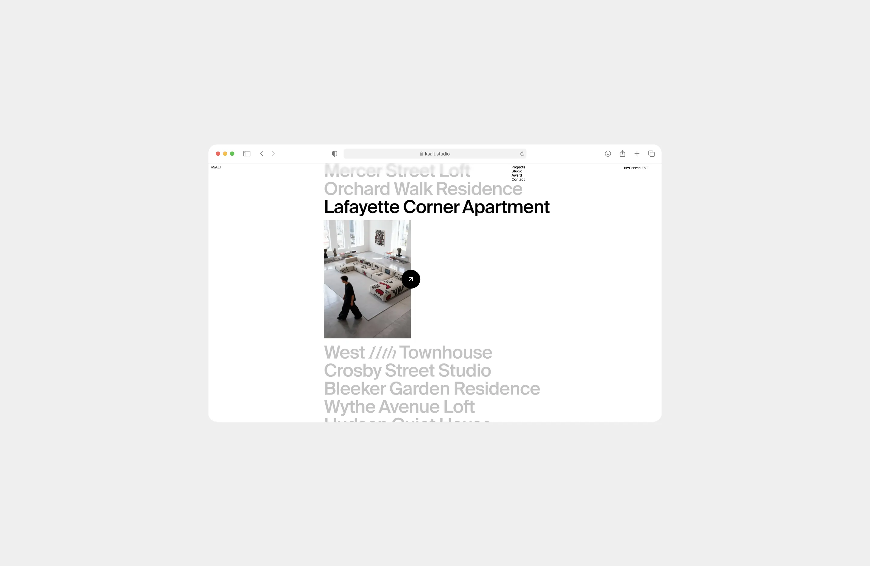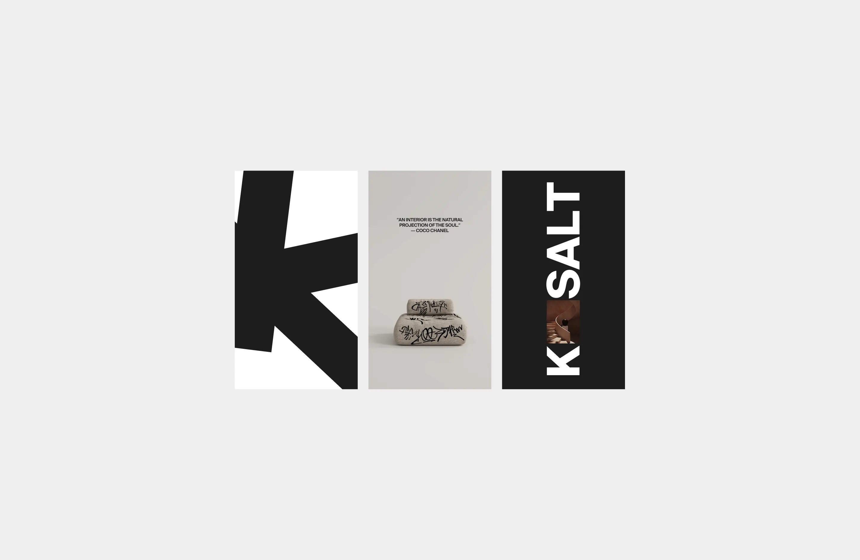 KSALT Interior Studio is a conceptual project for a New York interiors practice, blending editorial street cues with a bespoke, gallery feel. The focus is on restrained identity, calm layouts, and quietly confident touchpoints.